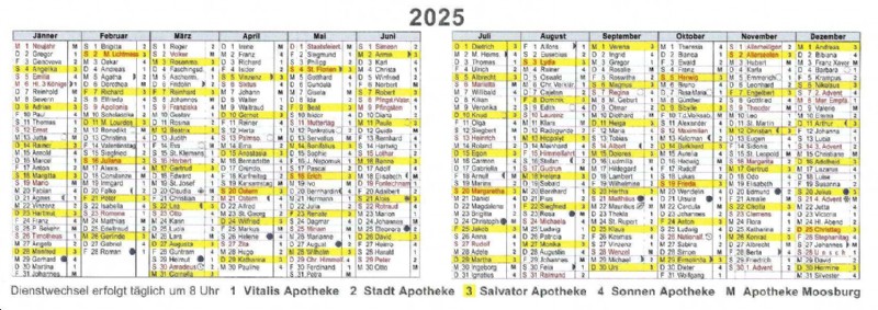 Den Apotheken Notdienst teilen wir uns mit der Stadt Apotheke, der Vitalis Apotheke, der Apotheke Bodensdorf und der Apotheke Moosburg.